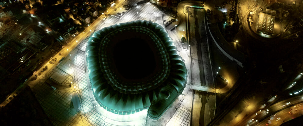 LED-belysning av Timsah Arenas utendørsområde: AEC Illuminazione ble valgt for LED-belysning av Timsah Arenas utendørsområde ved Timsah Arena i Tyrkia. Den imponerende strukturen ligger i byen Bursa og har 45 000 seter og en spilleflate på over 100 meter, viktige dimensjoner som også oppfyller regelverket for SüperLig. Timsah Arena har en tydelig krokodilleform, ettersom reptilet er symbolet til Bursaspor-klubben, som er hjemmelaget. Prosjektet, som ble innviet i 2015, kostet over 35 millioner euro og er en del av ytterligere 21 nye stadioner bygget av regjeringen.