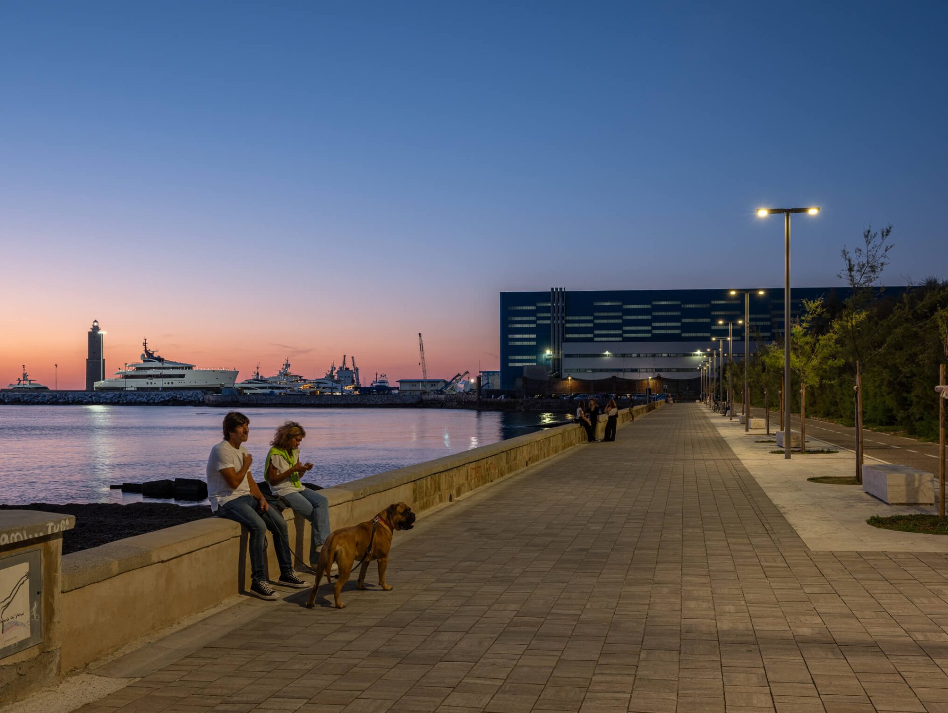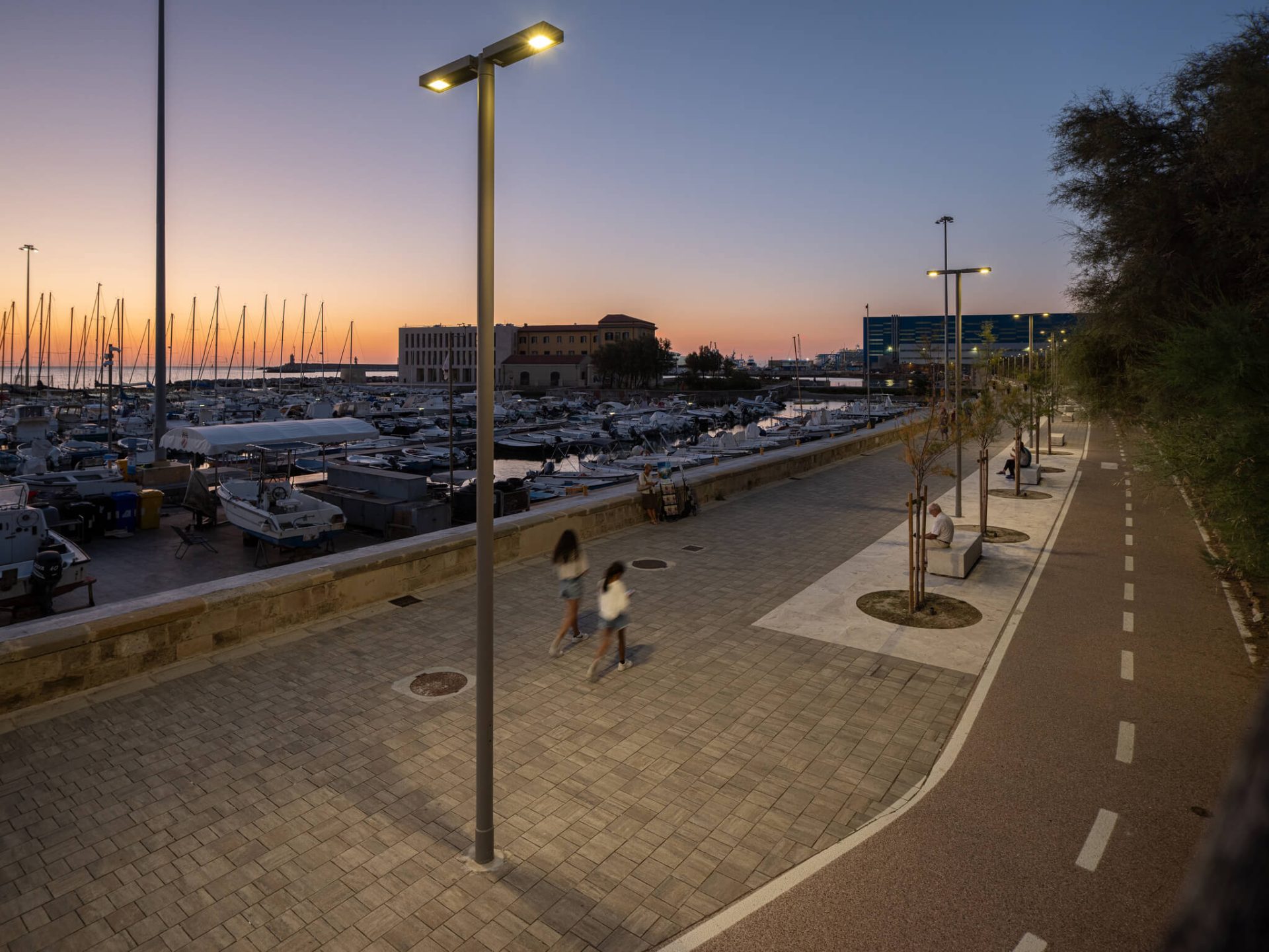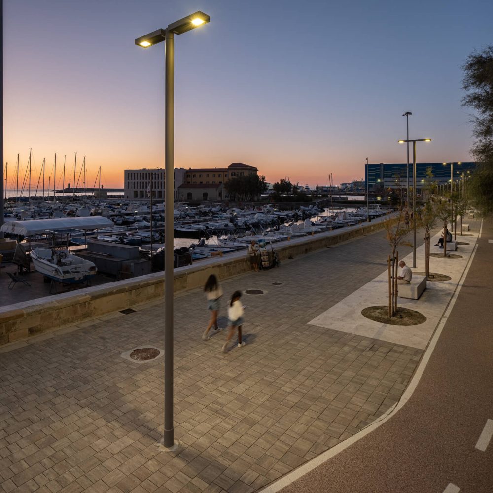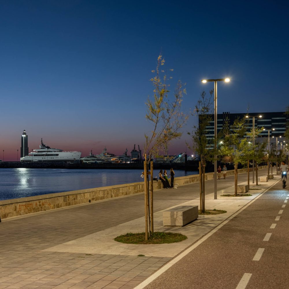 I denne sammenhengen har lyset ikke bare en teknisk funksjon, men bidrar også til å skape stedets atmosfære: det følger dem som går, inviterer til et opphold og gjør forholdet mellom byrom, havn og maritimt landskap mer harmonisk. AEC er stolt av å se denne delen av byen skinne i et nytt lys.